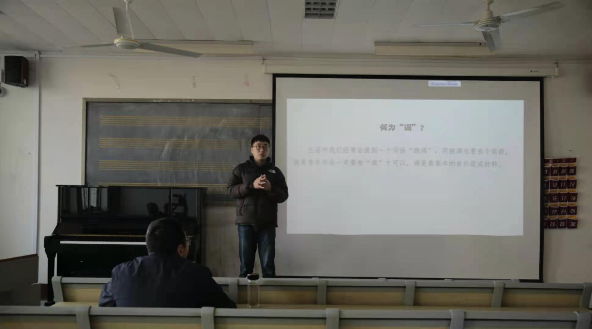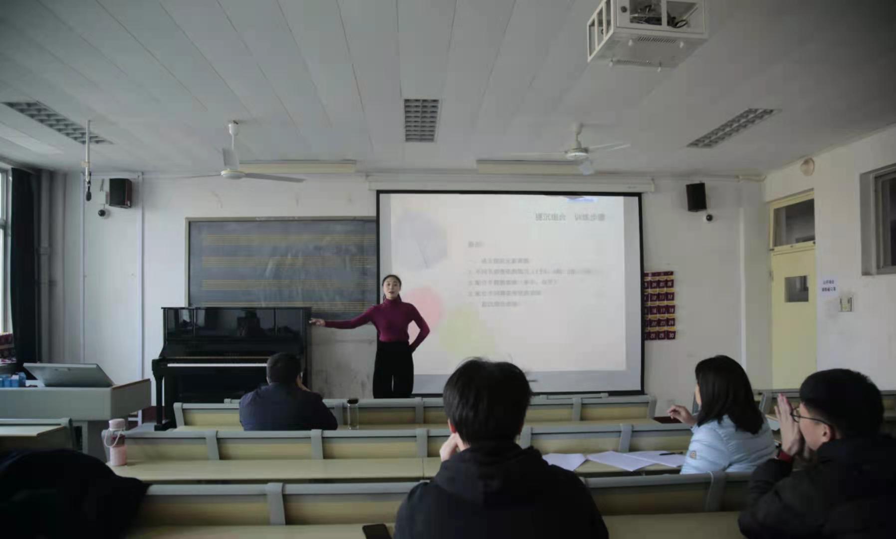 赛场上,琴瑟起,美人舞如莲花旋。桑文倩以一段优美的舞蹈拉开了《中国古典舞身韵》课的序幕,优美的语言、生动的案例、理论与实践相结合,一堂特色十足的实践课呈现在大家面前,整堂课韵味十足,令人回味无穷。随后,杨继鹏的《对调性和声中两个“小问题”的再思考》抛出了“正格进行与变格进行的分类是否合理”问题,大家带着思考,迅速将目光聚焦课堂。杨继鹏充分的讲解与剖析、耐心的引导与启发,环环相扣、循序渐进,充分调动了学生的积极性、提升课堂的凝聚力。