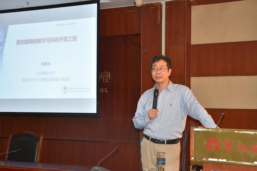 4月16日下午,由教师发展中心主办、物理科学与信息工程学院承办的2019年第6期教学工作坊在东湖宾馆一楼报告厅展开。北京邮电大学光电信息学院张晓光教授应邀主持《高校教师的教学与科研并重之路》教学工作坊,来自各教学单位的50余名教师聆听了报告。