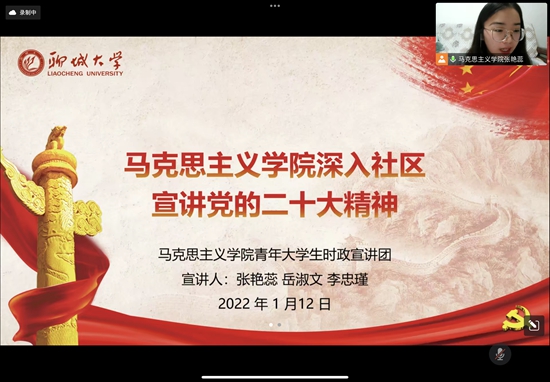 1月12日,宣讲团六组成员于山东省聊城市举办了线上宣讲活动。宣讲活动以23组关键词为重点,向社区居民宣讲党的二十大报告金句,阐述党的二十大精神内涵,并与社区居民进行点对点的沟通交流,在阐释党的二十大精神内涵的同时呼吁居民们继续学习党的精神。活动结束后,宣讲团成员及时整合活动材料,交流收获,总结反思,为今后继续传递党的精神火炬打下基础。