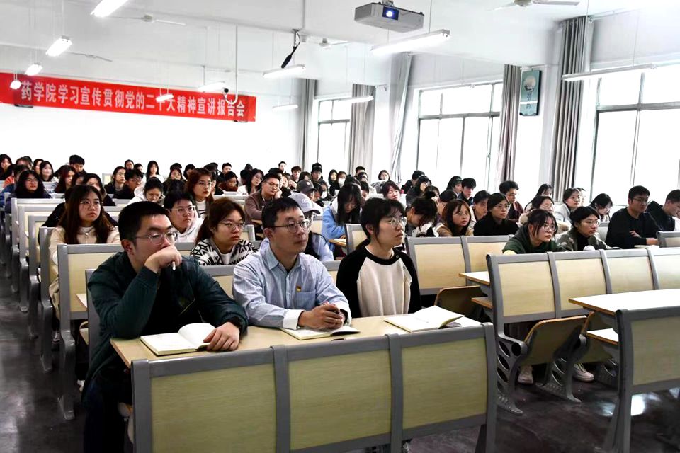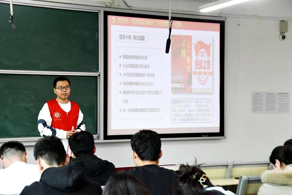 3月2日,马克思主义学院青年大学生时政宣讲团成员乔亚鲁在2号教学楼201教室作了题为《与时代共振 与民意同频——发展全过程人民民主 保障人民当家作主》的宣讲。药学院学生党员及2022级学生代表参加宣讲会。