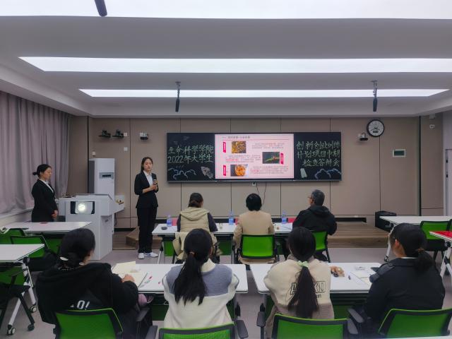 本次答辩会有八个团队参加,每个团队均派出一名成员上台对本团队的项目进行解说。每位讲解人依次上台,根据团队制作的PPT内容,对研究对象、研究方向、项目进展、专利获取情况、研究成果,以及发展前景等内容进行详细讲解,限时五分钟。选手们个个充满自信,对PPT内容的讲解流畅完整、条理清晰。随后由几位评委老师对选手的表现和团队的研究进行点评,并向选手提问有关问题。选手们都根据所学内容和本团队的研究现状,对评委的问题作出详细解答。八个项目各具特色,通过讲解人的解说,同学们对科技和不同产业创新有了新的理解。其中,湖北神农架文字衣科地衣型真菌的研究、广西大明山厚顶盘目地衣型真菌的研究,和冠突散囊菌优质菌种的筛选优化与鉴定,加快了新型菌种的研究进展,有利于优质菌种的选育和培养。药食同源蜂花粉山楂糕和绿色生物农药的开发,贴近日常生活,与企业合作并投入生产,则会优化人们的生活品质,带动经济发展。评委老师对每个项目进行精辟点评,指出项目亮点和特色,并一针见血地指出存在的问题,给出相应的建议。