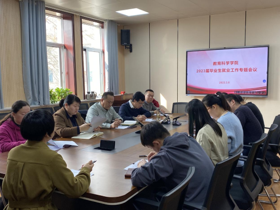 3月8日上午,教育科学学院在4C216会议室召开2023届毕业生就业工作专题会议,学院全体领导班子成员、系主任、辅导员、毕业生班主任参加会议。