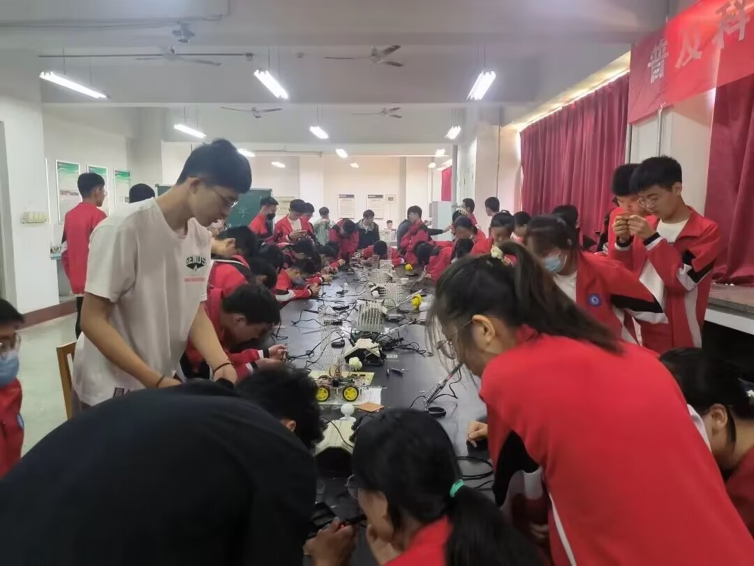 在科技微课堂志愿者们的带领下,同学们参观了位于综合实验楼5楼的数电、模电实验室和9楼的光学实验室。随后,E通科技社的成员结合自己的制作过程,对电路、光立方、广州塔和智能小车等作品进行了详细的讲解和全方位的展示。紧接着,三维协会的成员展示了3D打印的作品并讲述了工作原理。