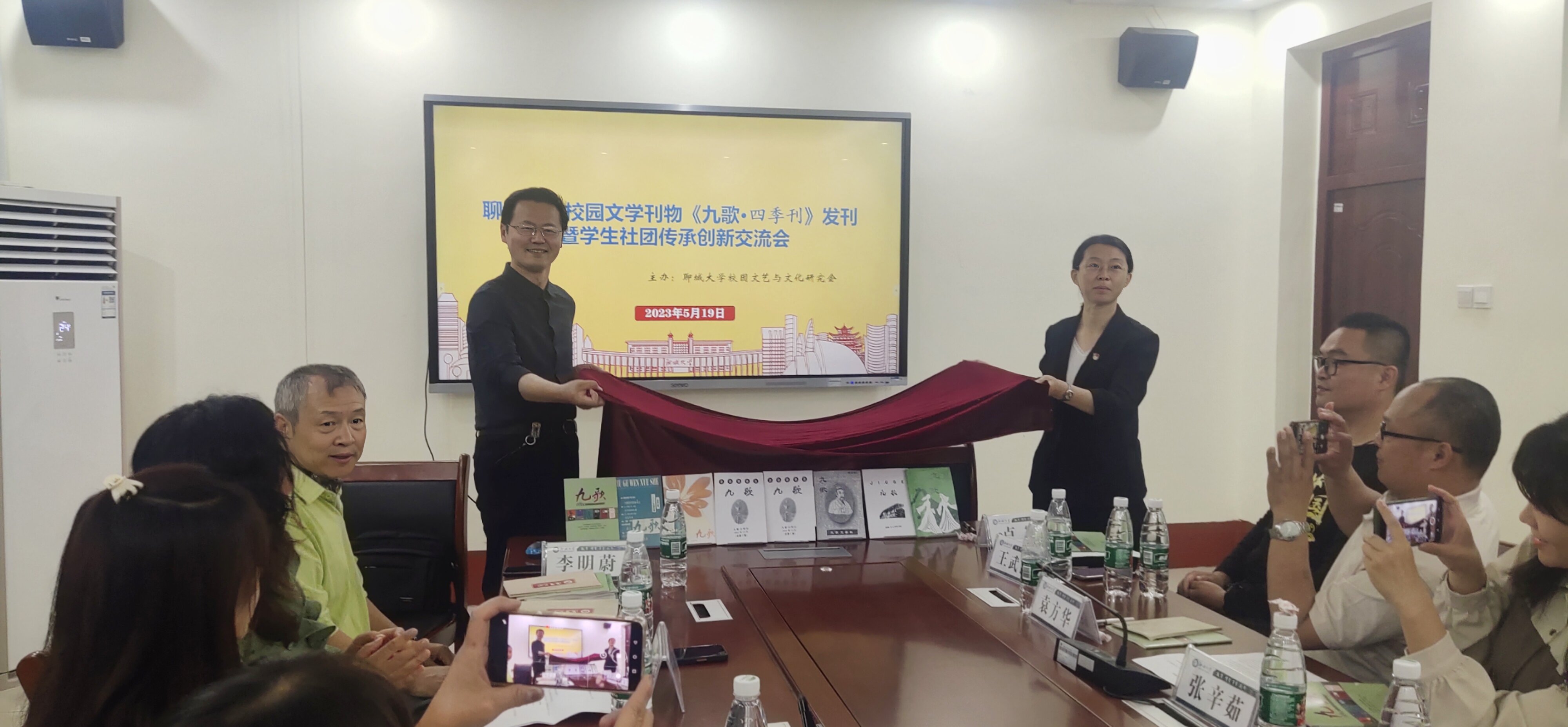 5月19日,博雅楼内文气勃郁,雅韵焕然,情彩飞扬。由文学院党委主管、校园文艺与文化研究会主办、党委宣传部审批备案的校园文学刊物《九歌·四季刊》发刊。文学院院长、刊物顾问卢军教授和研究会会长李明蔚为刊物“揭封”,校内外作家,热心作者,读者代表,聊城大学、东昌学院文学社会员代表共20余人参加了刊物发刊会暨学生社团传承创新交流会。