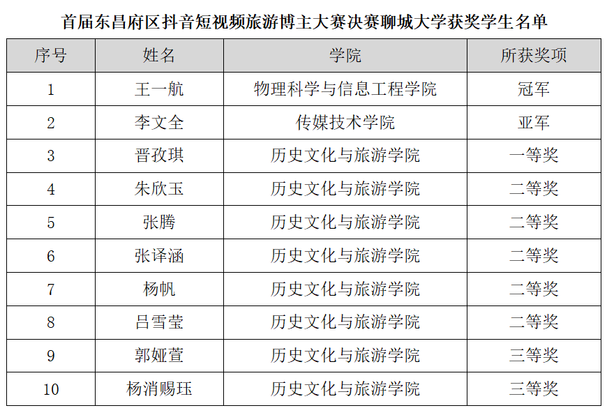 首届东昌府区抖音短视频旅游博主大赛是校地融合发展的重要项目,致力于加快智慧文旅人才培育,助力东昌府区文化和旅游事业的高质量发展。大赛以“为东昌府展现精彩,让梦想‘抖’起来”为主题,自启动以来,收到社会各界参赛作品达467件,抖音相关话题浏览量突破1900万,全方位呈现了东昌府区的自然生态之美、历史厚重之美、人文和谐之美和产业发展之美,取得良好的社会宣传效果。