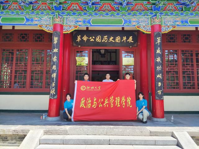 在西安市革命公园,在革命公园,服务队成员先后前往刘志丹同志汉白玉石像、烈士祠、革命亭和杨虎城将军铜像等地进行参观学习,了解革命烈士的英勇事迹。在承载着西安近代革命军民大无畏精神的合冢前,服务队成员自发默哀,将自己对革命先辈的无尽怀念留在这座公园中。