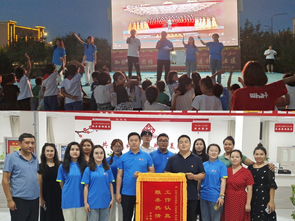 当日傍晚,服务队开展“红歌唱响时代,团结创造未来”主题晚会,活动在社区党员大合唱《团结就是力量》中拉开帷幕,服务队成员与小朋友共同演唱红色歌曲《国家》并以手势舞进行演绎,现场气氛热烈而融洽,通过一段段慷慨激昂的红色旋律、一首首振奋人心的经典歌曲深切表达对祖国的热爱。同时,服务队成员用饱满的热情演唱聊城大学校歌《飞向美好的明天》与第十一届全运会主题曲《相亲相爱》,以歌声搭建起民族团结的桥梁,赢得现场阵阵掌声与喝彩。活动在全体居民大合唱《歌唱祖国》中结束,新时代社区向服务队赠送锦旗,对服务队成员在支教期间的辛勤付出与劳动表示感谢,并欢迎服务队随时返回麦盖提县,齐心协力共同促进民族团结。