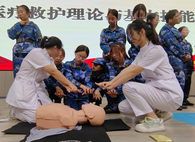 军训如火如荼地进行,训练科目不断丰富,战地医疗救护理论与基本技能培训科目成为面向全校的重要课程。培训现场,“医”心向阳志愿服务队成员使用模拟人为同学们进行理论讲解与实际操作,向大家生动形象的展示心肺复苏的重要步骤。新生们聚精会神,积极响应服务队成员的展示工作与实践号召,有序上台进行实操。服务队成员们在一旁细心纠正同学们出现的问题,并针对易错内容进行总结并重点学习。同学们基本了解了应急救护知识,提高了应对突发灾难和意外伤害的自救与互救能力。