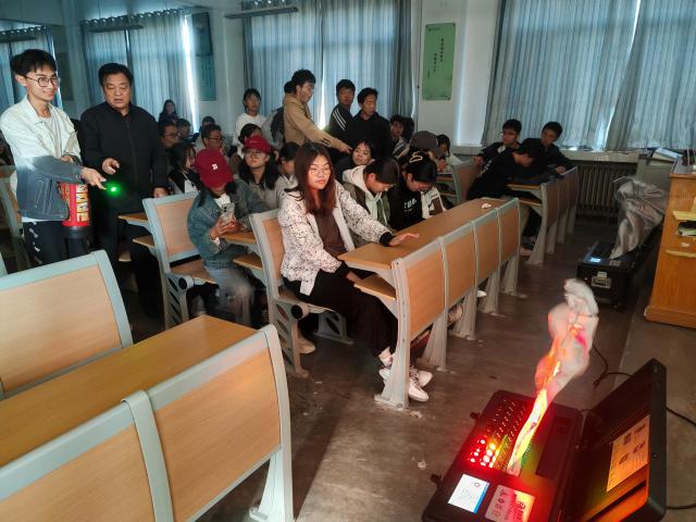 在消防安全知识与灭火器使用宣讲中,马飞通过讲述真实事例引起同学们对消防安全的重视,他向同学们介绍了校园火灾带来的危害,细致讲解了面临火灾时的自救方法,触目惊心的案例引发了同学们的深思,同学们认识到了认真学习消防安全相关知识,掌握灭火器使用方法的必要性。马国栋重点向同学们介绍了干粉灭火器的基本结构及使用时的注意事项,同时演示了灭火器的使用方法,并鼓励同学们积极参与到仿真灭火训练当中。同学们在相关人员的指导下,有序进行了仿真灭火训练。在训练中,同学们谨遵“一提、二拔、三握、四瞄、五压、六扫”的使用要领,拉下灭火器的保险销,将灭火器对准仿真火焰根部,同时压下把手左右横扫,直至火焰被成功“扑灭”。在训练结束后,同学们纷纷表示,本次活动让自己真正参与到了灭火器的操作当中,让理论知识落到实处,同时也提升了自己面对突发事件时的应变能力,增强了消防安全意识。