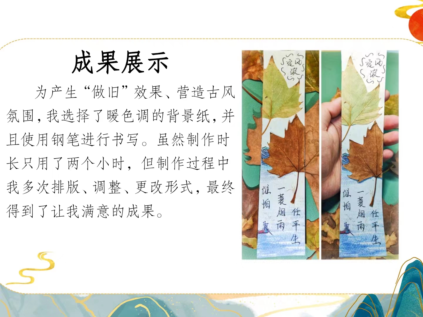 本次活动涌现了大批优秀的作品,其中郗美婷同学的书签制作精美,她在PPT中详细介绍了自己的创作灵感来源《钗头凤》,赞美了中华诗词文化的博大精深,传达了自己对读书的热爱之情。参加本次活动的同学表示,在寻找落叶的过程中探索发现了校园的美景,能够更加亲近自然,也逐步提高了自己的审美情趣。