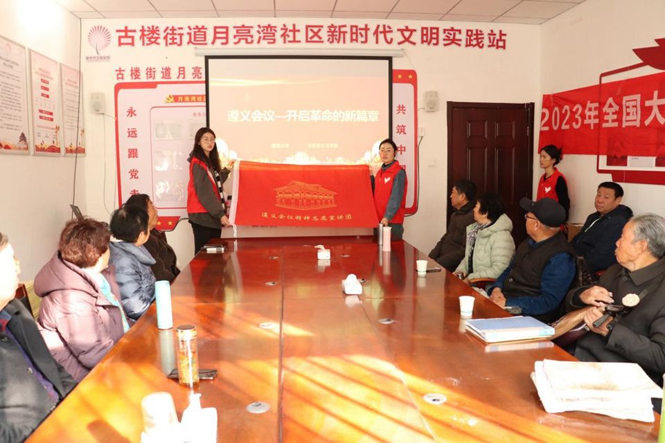 11月14日,马克思主义学院青年大学生时政宣讲团在聊城市古楼街道办事处月亮湾社区开展了题为《遵义会议—开启革命新篇章》的宣讲活动,宣讲团成员孟煜、郭昊铭担任主讲人,月亮湾社区居民代表参加此次宣讲活动。