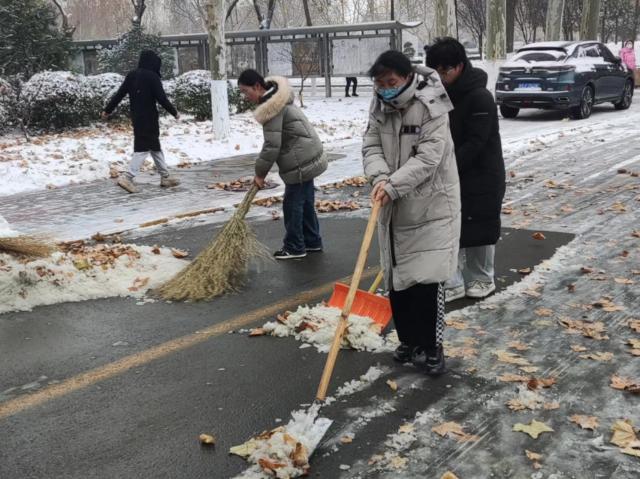 在物业楼管员的热情配合下,学院辅导员提前将扫把、除雪铲等清扫用具准备齐全,并叮嘱志愿者注意穿衣保暖和行路安全。志愿者集结齐全后,快速分为两组,一组负责用除雪铲铲出地面冻结积雪,一组负责用扫把清扫地面铲出的积雪,确保清扫工作高效、有序开展。寒风凌冽,积冰坚硬,艰苦的条件阻挡不住志愿者为师生们消除出行安全隐患的热情!志愿者们弓身铲雪,卖力扫雪的画面形成了校园里一道靓丽的风景线。大家分工明确,默契配合,不到一个小时,路上的积雪积冰就已经被清理得所剩无几,校园恢复往日的清洁干净。“在接到扫雪通知后我没有一丝犹豫而是迅速动员起来,按照负责人的安排到达指定场地,开始扫雪。”“这次扫雪活动给我一个为同学服务的机会,让我体会到服务奉献带来的幸福感。”两位志愿者分享各自的活动感悟。