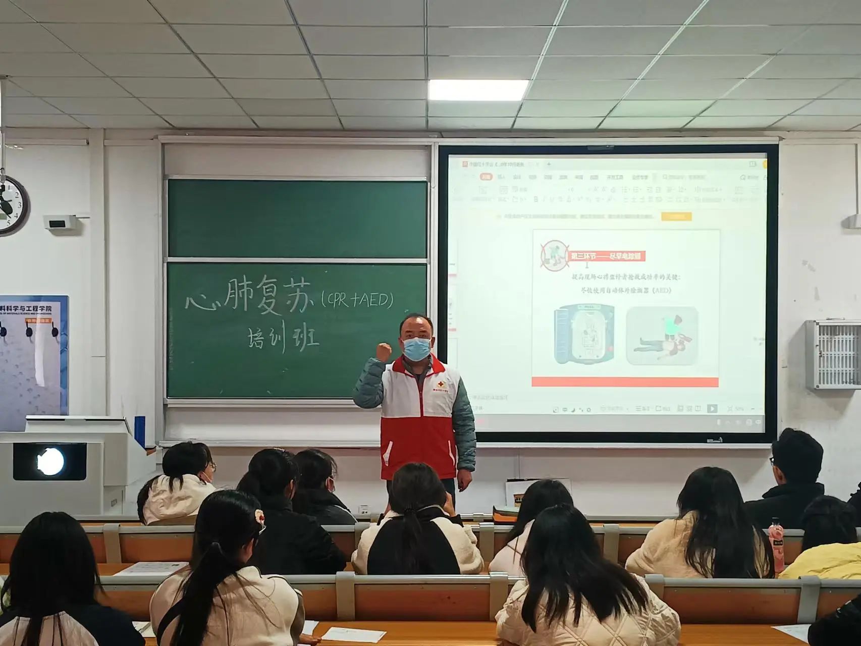 为进一步向广大师生宣传CPR(心肺复苏)以及AED(除颤器)的知识,提高同学们在急救知识上的素养和应急救护技能,12月10日,我校材料科学与工程学院于4#310开展心肺复苏(CPR+AED)培训暨第八期“点点生命护航队”技能培训会,活动特邀聊城市蓝天救援队的老师培训。 培训期间,蓝天救援队的老师们对心脏骤停的病因、特征以及心肺复苏的步骤进行了详细的讲解。随后模拟实操环节中,同学们表现出了极高的学习热情,各组负责人利用模拟人进行示范和讲解,重点指导了胸外心脏按压、清理口腔异物、开放气道、人工呼吸、按压深度和频率等操作要领,并及时纠正了同学们在实操中的错误,促进了理论与实践的融合。活动最后,蓝天救援队的老师们还安排了AED的辅助训练,帮助同学们更好地把握按压频率和动作的准确程度。 同学们纷纷表示,本次活动加深了对心肺复苏技能的掌握程度,了解了心肺复苏的操作步骤、操作手法以及心肺复苏对于抢救急救的重要性。 (审核 郑永朝)