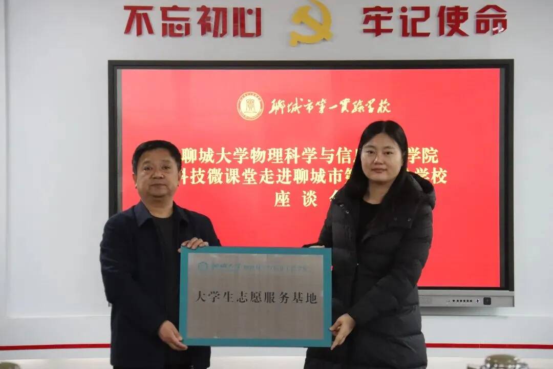 聊城市第一实验学校校长边传顺对学校科学学科课程开展、科学实验室建设、科技人才培养方案等方面进行了介绍。聊城大学物理科学与信息工程学院团委书记洪文静对学院历史、师资力量、科研设备等情况作了介绍,并表示希望与聊城市第一实验中学深挖志愿服务空间、创新志愿服务机制、提升志愿服务层次,实现中学教育与大学教育的良性互通。随后,双方为志愿服务基地授牌。