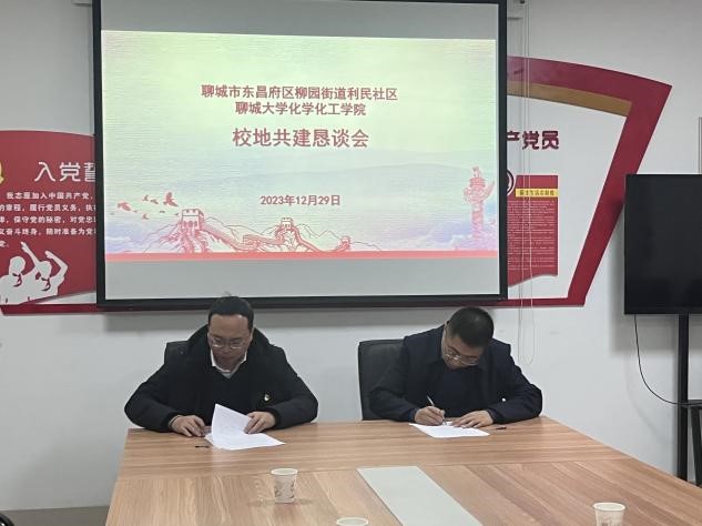 12月29日,聊城大学化学化工学院赴聊城市东昌府区柳园街道利民社区进行校地共建恳谈并签署校地共建协议。化学化工学院党委书记龚树文,党委副书记、副院长段艳林,团委副书记孙忠月,辅导员贾云超及学生代表参加会议,利民社区党委书记王学良、党委副书记杜曼等人出席会议。
