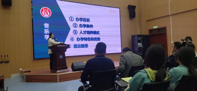 大家首先一起观看了聊城大学、音乐与舞蹈学院的招生专题片。音乐与舞蹈学院副院长王海华就聊城大学的发展历史、办学成就、招生政策,音乐学院的办学条件、专业设置、办学特色和优势、人才培养和研究生推免、招生就业情况等情况进行了说明。