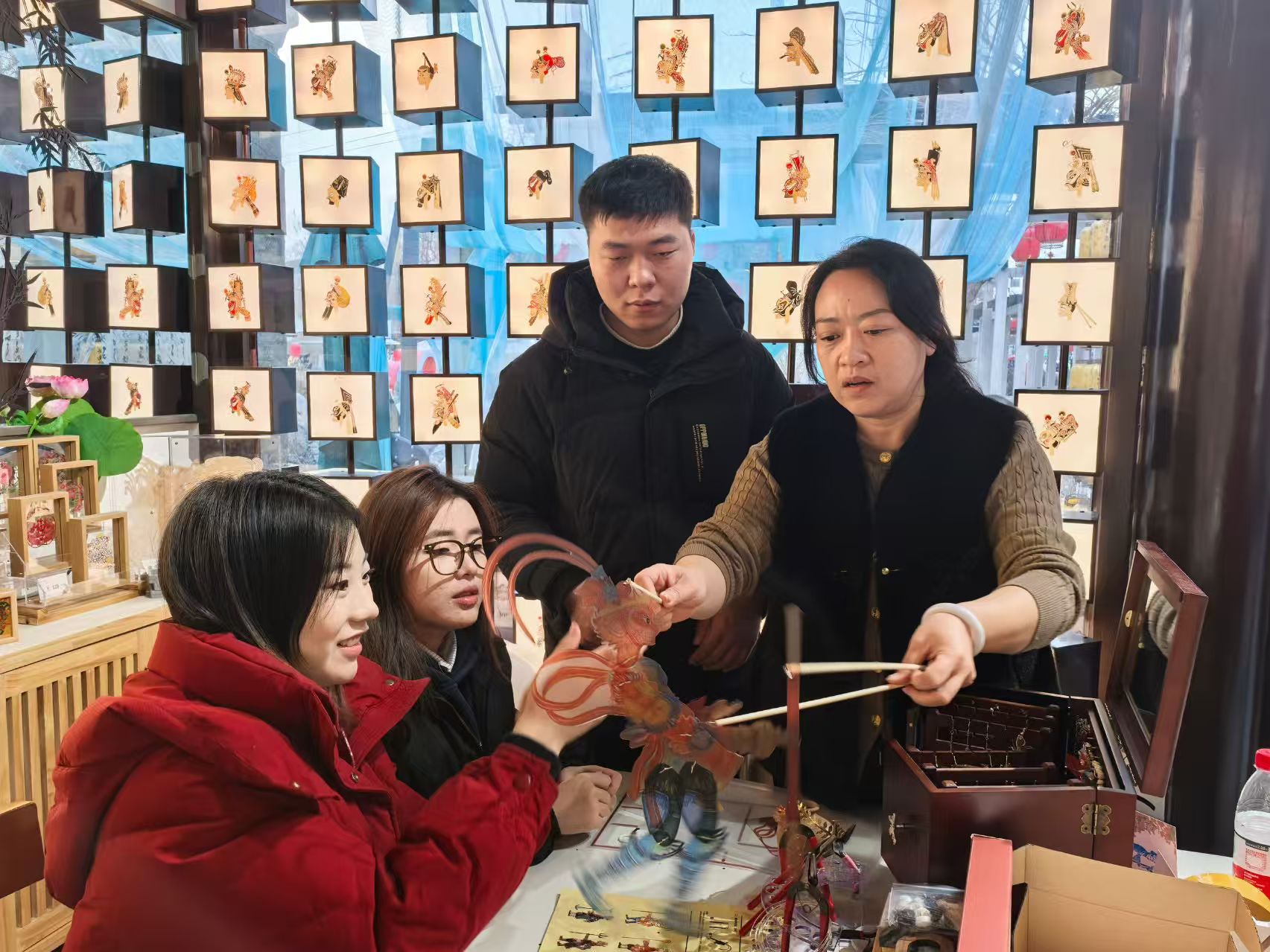 团队成员前往济南皮影青年之家,聆听济南皮影戏传承人深入浅出地讲解济南皮影戏的历史渊源、艺术特色等相关知识,观看《武松打虎》《孙悟空大战蝎子精》等经典剧目表演。在观影过程中,与传统印象中的皮影戏不同,团队成员能明显感受到济南皮影戏的独特之处,它巧妙融入现代化元素和笑料,经典故事结合当下热点,以幽默诙谐的语言被讲述,让人忍俊不禁,唱腔里也偶有现代音乐的韵律,使古老艺术得到焕新。这种现代化的创新让古老的皮影戏带来别样的观赏体验,既保留传统韵味,又符合当代各年龄段观众的喜好。在讲解期间,团队成员从游戏《黑神话︰悟空》中提出应如何看待科技带领非遗传承的问题,传承人表示,在当今科技创新的时代浪潮下,皮影戏艺术确实需要与时俱进,但前提是牢牢坚守其文化根本,只有在稳固根基的基础上合理创新,才能既让皮影戏贴合现代观众的审美需求,又不失其独特的艺术价值与文化内涵,实现传统文化的可持续传承与发展。在讲解与表演结束后,传承人现场传授皮影操纵技巧。团队成员认真聆听、仔细观察,纷纷亲自上台尝试,演绎一段段精彩小故事。在实践过程中,大家切实感受到济南皮影操纵的乐趣与挑战,也对济南皮影戏这一古老非遗艺术有了更为深刻地感悟与认知。