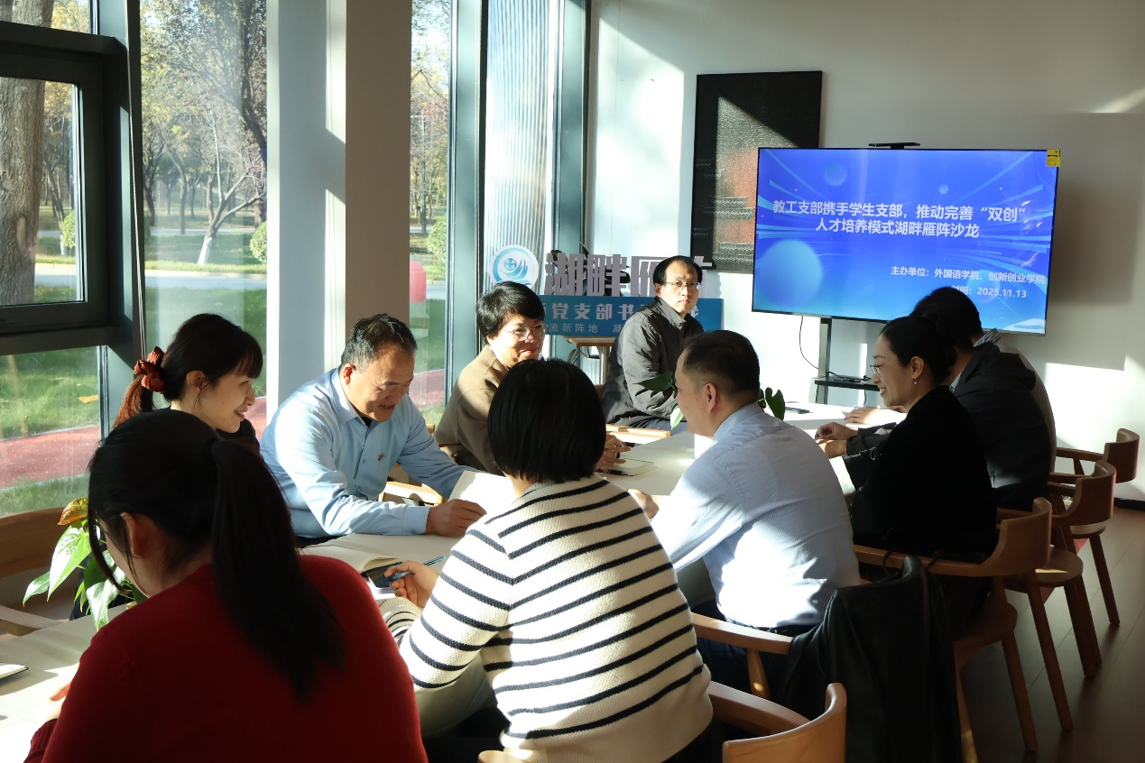 活动以党建为纽带,汇聚师生智慧,破解“双创”育人难题。外国语学院的教师回顾了近年来在创新创业领域的实践探索与阶段性成果,梳理了学院在双创项目培育、课程建设、平台搭建等方面的工作进展,并结合自身教学与实践经验,分享了工作思路与实施路径;学生代表立足自身双创实践经历,汇报了项目推进中的收获与瓶颈,就资源对接、技能提升、项目孵化等方面提出了具体需求并展开研讨。